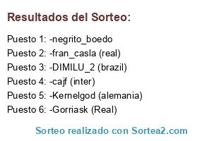 Lista de participantes: -Gorriask (Real), -Kernelgod (alemania), -DIMILU_2 (brazil), -cajf (inter), -fran_casla (real), -negrito_boedo.