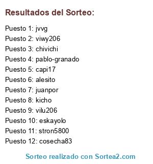 Lista de participantes: chivichi, cosecha83, vilu206, capi17, eskayolo, alesito, stron5800, jvvg, juanpor, kicho, pablo-granado, viwy206.