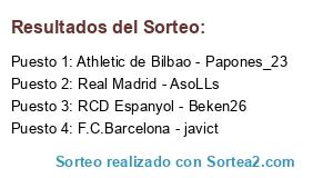Lista de participantes: Real Madrid - AsoLLs, F.C.Barcelona - javict, RCD Espanyol - Beken26, Athletic de Bilbao - Papones_23.