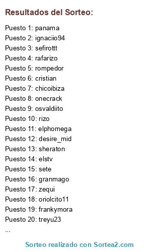 Lista de participantes: kortako, ignaciio94, assalito, sete, rafana, onecrack, davidiho10, jas_73, sefirottt, rompedor, elstv, roqueluis, elphomega, granmago, joseppenha, amatinho2, oriolcito11, cata8, sheraton, juandy, mescamilla, iru, cristian, zequi, panama, osvaldiito, frankymora, rizo, rafarizo, chicoibiza, desire_mid, treyu23.