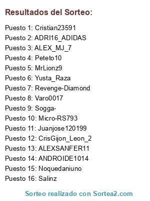 Lista de participantes: ADRI16_ADIDAS, ALEX_MJ_7, ANDROIDE1014, ALEXSANFER11, CrisGijon_Leon_2, Cristian23591, Juanjose120199, Micro-RS793, MrLionz9, Noquedaniuno, Peteto10, Revenge-Diamond, Salinz, Sogga-, Varo0017, Yusta_Raza.