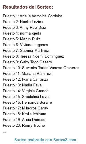 Lista de participantes: maru romero, norma ojeda, Anny Ruiz Diaz, Viviana Lugones, Gaby Todo Casero, Suvenirs Tortas Vanesa Graneros, Mariana Ramirez, Noelia Lezica , Ivana Carranza, Ro Segovia, Fernanda Soraire, Virginia Grande, Maruh Ruiiz, Nadia Fava, Mónica Gabriela Geréz, Sabrina Martinez, Kmila Ichihara, Shodelina Love , Milagros Garay, Teresa Noemi Dominguez, Analía Veronica Cordoba, Alicia Donoso, Yamii Cavs, Romy Troche.