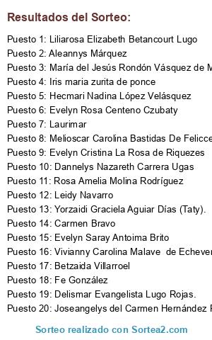 Lista de participantes: Adriannys Noemí Marcano de Rivas, Alba Rosa Marcano De Módica., Aleannys Márquez, Aleurys Marcano, Ana María Brito De Betancourt, Angélica María Marín Reyes, Anny Esther Obando Moya, Anyer Valenne de Cedeño Sandoval, Aracelys Alejandra Rosal Pino, Betzaida Villarroel, Bleidys Fernández, Carelys Auxiliadora García de Romero, Carlyn Carolina Hernández, Carmen Bravo, Crisbert Lezama Gomez, Crislenn Yazareth Amarista Marcano, Daily Dalmira de Carrera, Dalia Bravo, Damileth Mireidis Rodríguez de Subero., Damirly Raquel Pino Morey, Daniela Vargas, Dannelys Nazareth Carrera Ugas, Dariana Alejandra Parabavire de Miranda, Darlis Yosmira Velásquez Revilla, Deliangelis del Jesús Betancourt de Quijada, Delismar Evangelista Lugo Rojas., Dianney Coromoto Rojas de Ávila, Doisbel del valle de Manduca Bertoncini, Dora Ortiz, Efrannys Del V Farias de Rondón., Eliannys Villarroel, Eliver Zoraida González de González, Evelyn Cristina La Rosa de Riquezes, Evelyn Rosa Centeno Czubaty, Evelyn Saray Antoima Brito, Fe González, Gabriela Reyes Brito, Gabriela Virginia Brito Godoy, Geisamir Yolette Salazar Jiménez de Adrián, Génesis del Carmen Silva de Senluis, Glayses Salazar, Greisnelys Esther Carreño Quijada, Hecmari Nadina López Velásquez, Indira Legendre, Iris maria zurita de ponce, Irma Escobar Fermín, Islenis Herrera, Jennifer José Gallardo D Nuñez, Jhonilys Rosmar Navarro Morey de Ibáñez, Joseangelys del Carmen Hernández Rodríguez, Joseline Elizabeth Pino de Navarro, Karina Del V. Toro C, Karina José Gómez Salazar de Rosi, Karla Cristina Hernandez Medina, Katerine del valle Fernández Hernández, Katherine Sánchez de Bello, Laura Brito, Laurimar, Leidy Navarro, Liliarosa Elizabeth Betancourt Lugo, Lismar de Arias, Lismer Nazareth Rosal Pino, Livinel Guaita Piamo, Lorena Ysabel Martinez Moya, Luisangelis Rengel, María Angélica Briñez Ordozgoite, María De Los Angeles Tomės de Zapata, María del Jesús Rondón Vásquez de Marín, María Gabriela Maestre Noriega, Maria José Bellorin De Rivas, María Nahil Ramos de Ferreira, Marian Yarabi Girot Alcaino, Mariangel Jose Perez Fermin, Marianny de Los Angeles Carreño Cordova, Melioscar Carolina Bastidas De Felicce, Milángela Amelia León Acosta, Milena Nuñez, Nogleidys Broccko, Omarlis Sarai González de Tapisquen, Patricia de los Angeles de Agreda Farfan, Raicelys Paola Rojas Viñoles, Raquel Yonhalic Mieres Brito, Ronielvis Deyanira Rodulfo Marval, Rosa Amelia Molina Rodríguez, Rosa Carolina La Rosa De Moya, Rosa Yucelly Anchundia de Flores, Rosana Regnault, Rosangelys Fajardo De Linares, Rosanna Gómez Salazar, Rosmalis Martinez, Ruth Martínez, Ruthsely Adelina Daniel Montezuma., Saimar Geangris Morey Villarroel, Teodacsy de Hernandez, Vanessa Hernández de Luna, Vanessa Parra De Oliveros, Vicmary José Mata Tovar, Violeta Del valle Sanchez Bueno, virgilia Maria Aguilera de Bravo, Virginia Josefina León de Rondón, Vivianny Carolina Malave de Echeverría, Yelitza Caraballo, Yennifer González de González, Yetzabeth Mata de Rojas, Yoasly M.Lopez Rodríguez, Yorzaidi Graciela Aguiar Días (Taty)., Yris De Bello, Ysabel Rodriguez, Zaial Delit Rodriguez Mundarain.
