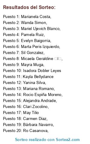 Lista de participantes: Ro Casanova,, Evelyn Baigorria, , Mariel Ujevich Blanco,, Yanina Silva,, Isadora Dobler Leyes, Micaela Geraldine ʚïɞ,, Mayra Muga, , Alejandra Andrade,, Bárbara Navarro,, Clari Zocolino, , Carmen Diaz, , Wanda Simon, , Rocio Espiña Moreno,, Sil Gonzalez, , Marianela Costa, , Pamela Ruiz, , Marta Peris Izquierdo,, Mariana Romano,, May Tilio, Kayla Bellydance, .