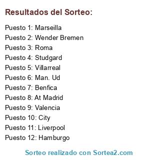 Lista de participantes: Hamburgo, Man. Ud, Liverpool, Studgard, Marseilla, At Madrid, Villarreal, Wender Bremen, Valencia, City, Benfica, Roma.