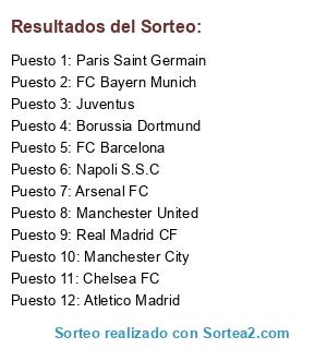 Lista de participantes: Real Madrid CF, FC Bayern Munich, FC Barcelona, Atletico Madrid, Chelsea FC, Manchester United, Napoli S.S.C, Paris Saint Germain, Borussia Dortmund, Juventus, Arsenal FC, Manchester City.