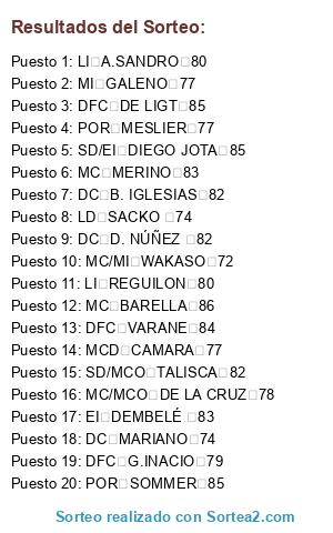 Lista de participantes: POR SOMMER 85, POR MESLIER 77, LD SACKO 74, DFC VARANE 84, DFC DE LIGT 85, LI REGUILON 80, LI A.SANDRO 80, DFC G.INACIO 79, MC BARELLA 86, MC MERINO 83, MI GALENO 77, MC/MI WAKASO 72, MCD CAMARA 77, MC/MCO DE LA CRUZ 78, SD/EI DIEGO JOTA 85, EI DEMBELÉ 83, DC D. NÚÑEZ 82, DC B. IGLESIAS 82, DC MARIANO 74, SD/MCO TALISCA 82.