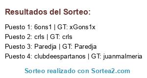 Lista de participantes: 6ons1 | GT: xGons1x, clubdeespartanos | GT: juanmalmeria, Paredja | GT: Paredja, crls | GT: crls.