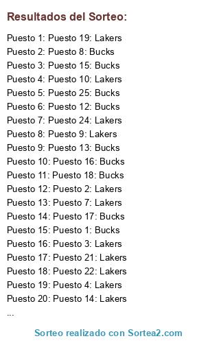 Lista de participantes: Puesto 1: Bucks, Puesto 2: Lakers, Puesto 3: Lakers, Puesto 4: Lakers, Puesto 5: Bucks, Puesto 6: Lakers, Puesto 7: Lakers, Puesto 8: Bucks, Puesto 9: Lakers, Puesto 10: Lakers, Puesto 11: Lakers, Puesto 12: Bucks, Puesto 13: Bucks, Puesto 14: Lakers, Puesto 15: Bucks, Puesto 16: Bucks, Puesto 17: Bucks, Puesto 18: Bucks, Puesto 19: Lakers, Puesto 20: Lakers, Puesto 21: Lakers, Puesto 22: Lakers, Puesto 23: Lakers, Puesto 24: Lakers, Puesto 25: Bucks, Puesto 26: Bucks.