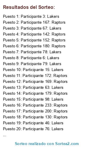 Lista de participantes: Lakers (122), Raptors (112).