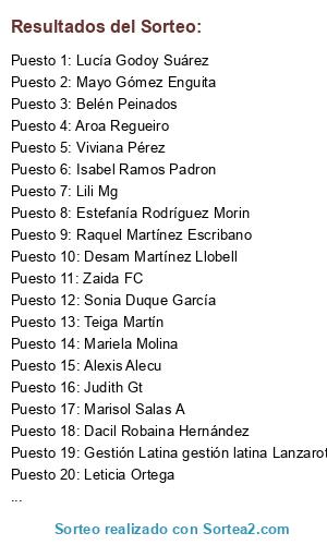 Lista de participantes: Mari Carmen Martín Cabrera, Sonia Duque García (2 participaciones), Glori Cat, Viviana Pérez, Gestión Latina gestión latina Lanzarote Lanzarote, Yovana Cruz Hernandez (2 participaciones), Raquel Martínez Escribano, Estefanía Sangines Álvarez (3 participaciones), Zaida FC, Mayo Gómez Enguita, Inma Duarte Ramos, Sonia Beato, Noelita Yo Yomismamente, Isabel Ramos Padron, Aroa Regueiro (34 participaciones), Belén Peinados, Desam Martínez Llobell, María José Martín Rodriguez, Lili Mg, Yackie Hp, Noelia Estupiñan H., Teiga Martín, Estefanía Rodríguez Morin, Sylvia Gb, Ángela María Paterson, Georgina Carmel Kennedy, Marisol Salas A, Marisol Hernández Cabrera, Leticia Ortega (2 participaciones), Lucía Godoy Suárez, Ascensión Suárez de León, Mariela Molina, Judith Gt, Alexis Alecu, Dacil Robaina Hernández , Dacil Robaina Hernández.
