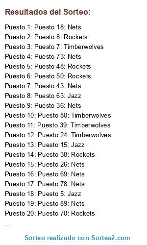 Lista de participantes: Puesto 1: Mavericks, Puesto 2: Timberwolves, Puesto 3: Jazz, Puesto 4: Nets, Puesto 5: Jazz, Puesto 6: Jazz, Puesto 7: Timberwolves, Puesto 8: Rockets, Puesto 9: Timberwolves, Puesto 10: Mavericks, Puesto 11: Jazz, Puesto 12: Mavericks, Puesto 13: Mavericks, Puesto 14: Nets, Puesto 15: Jazz, Puesto 16: Timberwolves, Puesto 17: Timberwolves, Puesto 18: Nets, Puesto 19: Timberwolves, Puesto 20: Nets, Puesto 21: Timberwolves, Puesto 22: Mavericks, Puesto 23: Jazz, Puesto 24: Timberwolves, Puesto 25: Rockets, Puesto 26: Nets, Puesto 27: Jazz, Puesto 28: Rockets, Puesto 29: Timberwolves, Puesto 30: Mavericks, Puesto 31: Rockets, Puesto 32: Timberwolves, Puesto 33: Timberwolves, Puesto 34: Jazz, Puesto 35: Timberwolves, Puesto 36: Nets, Puesto 37: Mavericks, Puesto 38: Rockets, Puesto 39: Timberwolves, Puesto 40: Timberwolves, Puesto 41: Jazz, Puesto 42: Jazz, Puesto 43: Nets, Puesto 44: Mavericks, Puesto 45: Mavericks, Puesto 46: Nets, Puesto 47: Mavericks, Puesto 48: Rockets, Puesto 49: Jazz, Puesto 50: Rockets, Puesto 51: Rockets, Puesto 52: Nets, Puesto 53: Timberwolves, Puesto 54: Rockets, Puesto 55: Nets, Puesto 56: Rockets, Puesto 57: Nets, Puesto 58: Nets, Puesto 59: Nets, Puesto 60: Nets, Puesto 61: Timberwolves, Puesto 62: Mavericks, Puesto 63: Jazz, Puesto 64: Rockets, Puesto 65: Mavericks, Puesto 66: Timberwolves, Puesto 67: Timberwolves, Puesto 68: Rockets, Puesto 69: Nets, Puesto 70: Rockets, Puesto 71: Nets, Puesto 72: Nets, Puesto 73: Nets, Puesto 74: Rockets, Puesto 75: Nets, Puesto 76: Timberwolves, Puesto 77: Nets, Puesto 78: Nets, Puesto 79: Jazz, Puesto 80: Timberwolves, Puesto 81: Timberwolves, Puesto 82: Rockets, Puesto 83: Jazz, Puesto 84: Jazz, Puesto 85: Timberwolves, Puesto 86: Rockets, Puesto 87: Jazz, Puesto 88: Rockets, Puesto 89: Nets, Puesto 90: Nets, Puesto 91: Rockets, Puesto 92: Rockets, Puesto 93: Jazz, Puesto 94: Timberwolves, Puesto 95: Nets, Puesto 96: Jazz, Puesto 97: Timberwolves, Puesto 98: Mavericks, Puesto 99: Nets, Puesto 100: Timberwolves, Puesto 101: Timberwolves, Puesto 102: Rockets, Puesto 103: Timberwolves, Puesto 104: Jazz, Puesto 105: Nets, Puesto 106: Jazz, Puesto 107: Nets, Puesto 108: Timberwolves, Puesto 109: Timberwolves, Puesto 110: Nets, Puesto 111: Rockets.