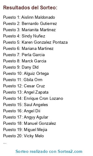 Lista de participantes: Karla Angeles , Itzel DC , Santander Kary , Aislinn Maldonado , Maty Castro , Eve Valdivia , Josesito Lo Ez , Isela De Gonzalez , Karen Gonzalez Pontaza , Yuyis Naye Nieto , Yazmin Leon , Toga Eri , Diana Viri Perez , Abel Moreno , Lesly Cruz , Perla Garcia , Maribel Aguilar Clemente , Angel Zapata , Jes JN , Enrique Cron Lozano , Samuel Santos , Maribel Alcantara , Gbila Orm , Marck Garcia , Bernardo Gutierrez , Mike VD , Angel Dii , Opticas Moctezuma , Dante Delgado , Virginia Perez , Dany Dld , Matiana Mati Paredes , Negrita Gomez , Miguel Mejia , Lucia Gomez , Yesenia Gomes , Ney Islas , Mariana Martinez , Pao Mendoza , Alguiz Ortega , Melani Ariana Tellez Romero , Manuel Gonzalez , Silverio Mejia , Karmina Castillo , Luna Rota , Abraham Anzueto Lopez , Saul Angeles , Angye Moedano , Marianita Martinez , Hellen Cabrera Martinez , Karliitha Orozco , Johana Guadalupe Castillo , Jocelyn Quiterio , Namzug Narud Brisa , Maria Martinez , Sheila Lopez , Erick Agjz , Angyy Agular , Lizy FJ , Alejandra Agustinii , Sindy Nuñez , Cesar Cruz , Javier Meza , Jimenez Eric , Leonardo Negrete , Daniela Palafox Valencia , Vicky Melo , Jose Antonio Sanchez.