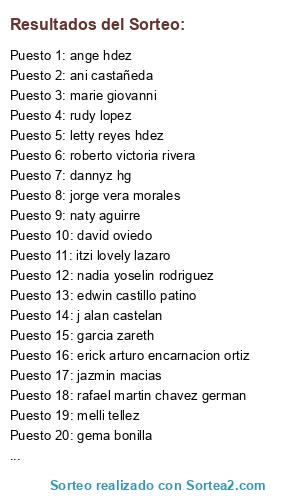 Lista de participantes: julio alonso, viri duran, jimmy lara, nadiux princes, lorena hernandez perez, danny moreno, vio sotelo, peragu hei, dannyz hg, marlen garcia, marlu nujard, garcia zareth, jany spargo, erick arturo encarnacion ortiz, ani castañeda, felipe nabori, rafael martin chavez german, marvin ney m e, vii escorcia, juan roberto gonzalez velasco, jazmin macias, edwin castillo patino, kari gonzalez vite, bren almonaci, fuhr caro, naty aguirre, marie giovanni, isabel luna ramirez, yikiu alejandra borja hernandez, alejandra zamora, nancy hernandez, osvaldo oso, emmanuel hernandez santiago, angie pickles, david oviedo, melli tellez, roberto victoria rivera, mary ross, ubaldo curiel, ange hdez, itzi lovely lazaro, fernando aguilar, alexander arizpe, eliot ness, marilu mtz, lorel curiel, ana km chavez, gerardo islas perez, lupita quiroz, letty reyes hdez, paty badillo, nadia yoselin rodriguez, jassai pontaza flores, j alan castelan, adrian mendez, armando andrez, bere nice magh, jorge vera morales, maysin zarate, angy corch, a teffany oaxaca, ivonne oaxaca, rudy lopez, maricar sanchez, rocio alvarado, alejandra bustamante, mariana elizabeth, carolain garcia, gema bonilla.