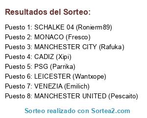 Lista de participantes: VENEZIA (Emilich), MONACO (Fresco), LEICESTER (Wantxope), MANCHESTER CITY (Rafuka), CADIZ (Xipi), MANCHESTER UNITED (Pescaito), SCHALKE 04 (Ronierm89), PSG (Parrika).