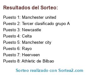 Lista de participantes: Heerveen, Celta, Tercer clasificado grupo A, Manchester city, Rayo, Newcastle, Athletic de Bilbao, Manchester united.
