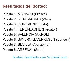Lista de participantes: VALENCIA (AlePGL), REAL MADRID (Wan), DORTMUND (Fista), BAYERN LEVERKUSEN (Baricelli), SEVILLA (Alenzema), FENERBACHE (Predator), MONACO (Fresco), ARSENAL (Soto).