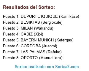 Lista de participantes: CORDOBA (Juanmi), LAS PALMAS (Rafuka), OPORTO (Manuel lara), DEPORTE IQUIQUE (Kamikaze), BAYERN MUNICH (Kefergas), CADIZ (Xipi), MILAN (Wakandu), BESIKTAS (Sergiocule).