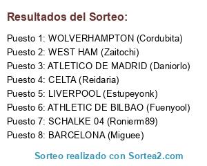 Lista de participantes: LIVERPOOL (Estupeyonk), VILLAREAL (Negri), ATHLETIC DE BILBAO (Fuenyool), FIORENTINA (aNDY), GENOA (Giianss), BOCA JUNIORS (Luiso), RIVER PLATE (Adri), JUVENTUS (Jiliyo).