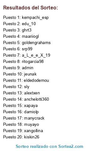 Lista de participantes: admin, muyayo, a_L_e_e_X_19, srp99, alextxen, xangollina, jeunak, maariiogl, manycrack, anchelotti360, sly, eldedodemou, goldengrahams, edu_10, ghrt3, xapaya, kempachi_esp, ritogarcia98, damiolp, kiskin26.