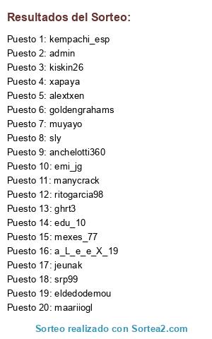 Lista de participantes: admin, muyayo, a_L_e_e_X_19, srp99, alextxen, emi_jg, jeunak, maariiogl, manycrack, anchelotti360, sly, eldedodemou, goldengrahams, edu_10, ghrt3, xapaya, kempachi_esp, ritogarcia98, mexes_77, kiskin26.