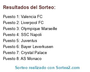 Lista de participantes: Crystal Palace, Valencia FC, Liverpool FC, Juventus, Bayer Leverkusen, SSC Napoli, Olympique Marseille, AS Monaco.
