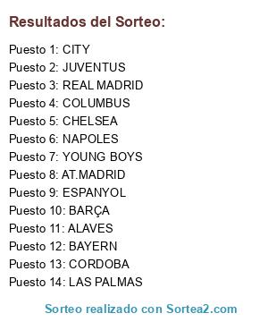 Lista de participantes: AT.MADRID, BAYERN, YOUNG BOYS, CHELSEA, COLUMBUS, CORDOBA, ALAVES, BARÇA, JUVENTUS, CITY, NAPOLES, ESPANYOL, REAL MADRID, LAS PALMAS.