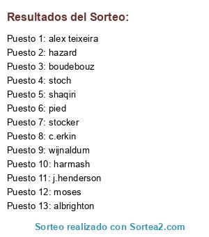 Lista de participantes: moses, stoch, c.erkin, alex teixeira, pied, hazard, albrighton, j.henderson, boudebouz, wijnaldum, shaqiri, stocker, harmash.