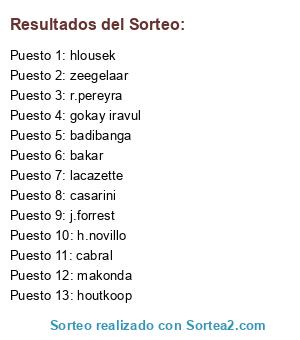 Lista de participantes: j.forrest, zeegelaar, bakar, hlousek, makonda, r.pereyra, houtkoop, cabral, casarini, lacazette, badibanga, gokay iravul, h.novillo.