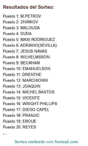 Lista de participantes: SIMAO, BECKHAM, KILBANE, PARK JU SUNG, VICENTE, JOAQUIN, MARCHIONNI, QUARESMA, MANCINI(MILAN), RIERA, S.CAZORLA, EMANUELSON, ADRIANO(SEVILLA), REYES, M.PETROV, WRIGHT-PHILLIPS, CAMORANESI, PIENAAR, BRESCIANO, MALOUDA, SCHWEINTEIGER, MILNER, DUDA, JESUS NAVAS, MAXI RODRIGUEZ, MARL GONZALEZ, WILHELMSSON, VALENCIA, EBOUE, ZHIRKOV, PRANJIC, JONAS GUTIERREZ, MICHEL BASTOS, FILIPE, DIEGO CAPEL, DRENTHE, CICINHO, MICAH RICHARDS, A.GUARDADO, SRNA.