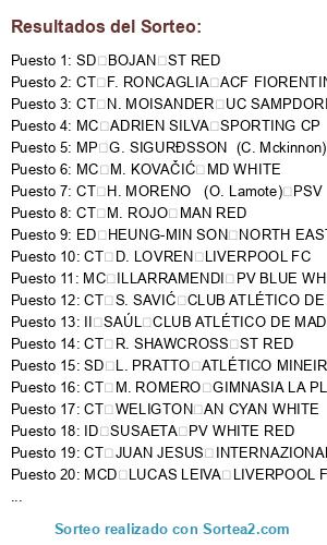 Lista de participantes: MCD LUCAS LEIVA LIVERPOOL FC, SD BOJAN ST RED, MC ADRIEN SILVA SPORTING CP, CT A. RAMI AN WHITE RED, II SAÚL CLUB ATLÉTICO DE MADRID, CT R. SHAWCROSS ST RED, ID SUSAETA PV WHITE RED, MC Y. M'VILA WEARSIDE, CT H. MORENO (O. Lamote) PSV EINDHOVEN, CT F. RONCAGLIA ACF FIORENTINA, II Z. TOŠIĆ PFK CSKA MOSKVA, CT N. MOISANDER UC SAMPDORIA, CT WELIGTON AN CYAN WHITE, CT D. LOVREN LIVERPOOL FC, ED F. ORELLANA GA CYAN, SD A. LJAJIĆ INTERNAZIONALE, MCD F. COQUELIN ARSENAL FC, MC J. HENDERSON LIVERPOOL FC, EI MUNIAIN PV WHITE RED, SD L. PRATTO ATLÉTICO MINEIRO, CT M. ROJO MAN RED, CT M. ROMERO GIMNASIA LA PLATA, II D. TADIĆ HAMPSHIRE RED, CT JUAN JESUS INTERNAZIONALE, EI RODRIGO ED WHITE ORANGE, MC ILLARRAMENDI PV BLUE WHITE, ED HEUNG-MIN SON NORTH EAST LONDON, MC M. KOVAČIĆ MD WHITE, CT S. SAVIĆ CLUB ATLÉTICO DE MADRID, MP G. SIGURÐSSON (C. Mckinnon) WEST GLAMORGAN CITY.