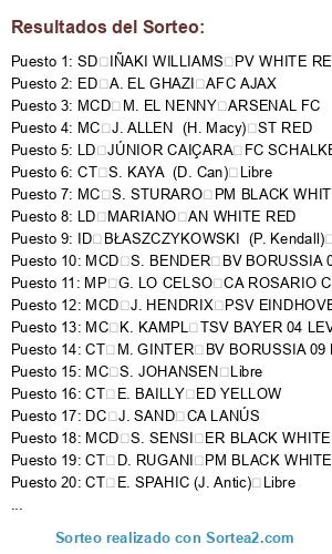 Lista de participantes: LD MARIANO AN WHITE RED, CT SIDNEI GA BLUE WHITE, CT MARCANO DL BLUE WHITE, MCD S. BENDER BV BORUSSIA 09 DORTMUND, MP S. BOUFAL LILLE OSC MÉTROPOLE, MC DENIS SUÁREZ ED YELLOW, CT E. SPAHIC (J. Antic) Libre, ID BŁASZCZYKOWSKI (P. Kendall) ACF FIORENTINA, CT S. KAYA (D. Can) Libre, MC J. ALLEN (H. Macy) ST RED, MCD J. HENDRIX PSV EINDHOVEN, MC S. JOHANSEN Libre, CT M. GINTER BV BORUSSIA 09 DORTMUND, DC J. SAND CA LANÚS, MC S. STURARO PM BLACK WHITE, MC D. DRINKWATER EAST MIDLANDS, MC K. KAMPL TSV BAYER 04 LEVERKUSEN, MCD M. EL NENNY ARSENAL FC, SD IÑAKI WILLIAMS PV WHITE RED, CT D. RUGANI PM BLACK WHITE, ED A. EL GHAZI AFC AJAX, LD JÚNIOR CAIÇARA FC SCHALKE 04, CT E. BAILLY ED YELLOW, CT A. RÜDIGER AS ROMA, EI E. ELIA FEYENOORD ROTTERDAM, MP D. ALLI NORTH EAST LONDON, LD NÉLSON SEMEDO SL BENFICA, MP G. LO CELSO CA ROSARIO CENTRAL, EI A. YOUNES AFC AJAX, MCD S. SENSI ER BLACK WHITE.