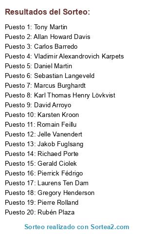 Lista de participantes: Tony Martin, Allan Howard Davis, Sebastian Langeveld, Jelle Vanendert, Romain Feillu, David Arroyo, Jakob Fuglsang, Rubén Plaza, Karsten Kroon, Vladimir Alexandrovich Karpets, Gregory Henderson, Laurens Ten Dam, Daniel Martin, Richaed Porte, Pierrick Fédrigo, Gerald Ciolek, Pierre Rolland, Carlos Barredo, Marcus Burghardt, Karl Thomas Henry Lövkvist.