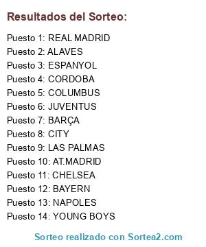 Lista de participantes: AT.MADRID, BAYERN, YOUNG BOYS, CHELSEA, COLUMBUS, CORDOBA, ALAVES, BARÇA, JUVENTUS, CITY, NAPOLES, ESPANYOL, REAL MADRID, LAS PALMAS.