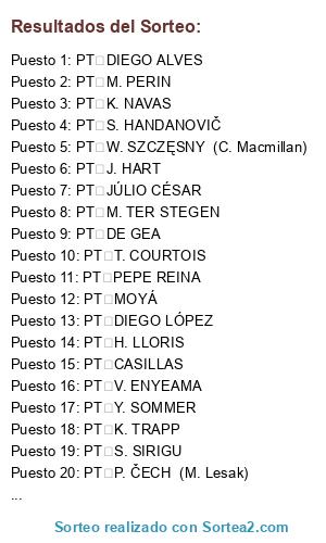 Lista de participantes: PT M. NEUER, PT G. BUFFON, PT T. COURTOIS, PT D. DE GEA, PT I. CASILLAS, PT P. ČECH, PT H. LLORIS, PT D. LÓPEZ, PT S. SIRIGU, PT S. HANDANOVIČ, PT T. KRUL, PT ROBERTO, PT J. HART, PT D. ALVES, PT M. PERIN, PT J. CILLESSEN, PT NETO, PT M. DE SANCTIS, PT T. HOWARD, PT I. AKINFEEV, PT S. RUFFIER, PT Y. SOMMER, PT F. MARCHETTI, PT S. MANDANDA, PT V. ENYEAMA, PT R. WEIDENFELLER, PT C. CARRASSO, PT JULIO CESAR, PT D. BENAGLIO, PT C. BRAVO.