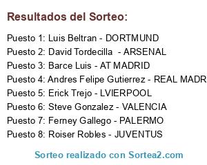 Lista de participantes: Luis Beltran - DORTMUND, Andres Felipe Gutierrez - REAL MADRID, Roiser Robles - JUVENTUS, David Tordecilla - ARSENAL, Ferney Gallego - PALERMO, Steve Gonzalez - VALENCIA, Barce Luis - AT MADRID, Erick Trejo - LVIERPOOL.