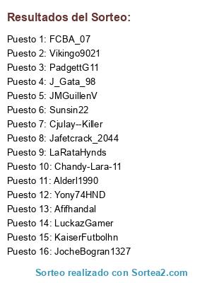 Lista de participantes: Afifhandal, Alderl1990, Chandy-Lara-11, Cjulay--Killer, FCBA_07, J_Gata_98, Jafetcrack_2044, JMGuillenV, JocheBogran1327, KaiserFutbolhn, LaRataHynds, LuckazGamer, PadgettG11, Sunsin22, Vikingo9021, Yony74HND.