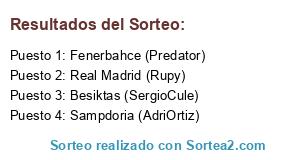 Lista de participantes: Fenerbahce (Predator), Sampdoria (AdriOrtiz), Real Madrid (Rupy), Besiktas (SergioCule).