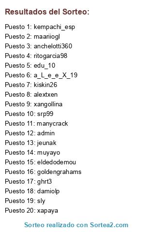 Lista de participantes: admin, muyayo, a_L_e_e_X_19, srp99, alextxen, xangollina, jeunak, maariiogl, manycrack, anchelotti360, sly, eldedodemou, goldengrahams, edu_10, ghrt3, xapaya, kempachi_esp, ritogarcia98, damiolp, kiskin26.