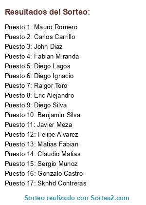 Lista de participantes: John Diaz, Carlos Carrillo, Eric Alejandro, Fabian Miranda, Diego Ignacio, Matias Fabian, Felipe Alvarez, Claudio Matias, Gonzalo Castro, Mauro Romero, Diego Lagos, Diego Silva, Sknhd Contreras, Javier Meza, Raigor Toro, Sergio Munoz, Benjamin Silva.