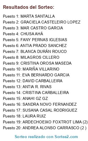 Lista de participantes: ANDREA ALONSO CARRASCO (2 ), ANTIA PRADO SANCHEZ (4 participaciones), EVA BERNARDO GARCIA (3 participaciones), ANTIA R. RIVAS (13 participaciones), CRISTINA CARBALLEIRA (2 participaciones), CHUSA AHÁ , ARDECHOEIXO FOXTROT LIMA (2) BÁRBARA CASANOVA (2 participaciones), LAURA RUIZ , SUSANA CASAL RODRIGUEZ , GRACIELA CASTELEIRO LOPEZ , SANDRA NOVO FERNANDEZ (2 participaciones), MAR CASTRO GARCIA (17 participaciones), FANY PERNAS IGLESIAS (3 participaciones), MARTA SANTALLA (25 participaciones), MARIÑA VILLARINO (3 participaciones), DAVID CARBALLEIRA (3 participaciones), MILAGROS CILLERO (2 participaciones), CRISTINA OROSA MASEDA (3 participaciones), BLANCA DURÁN ROUCO (7 participaciones), ANAHI GZ GZ , ANAHI GZ GZ.