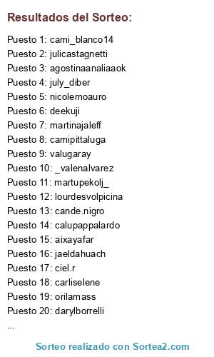 Lista de participantes: camipittaluga, agostinaanaliaaok, juliluk, juli.dagotto(2 participaciones), romibaldo, ciel.r, camiila_victoria, pocketsizedperfectionist, july_diber, larasantt, gabiifrattini, irmaperotti, meligomez1603, lulagraziano (3 participaciones), fatimaromero_27, jazpatricio, soldallacqua, josefinalahargou, camidominguezr, martigianorio, julicastagnetti, carliselene, calupappalardo, mileemacias, carochaparroo, zap_agustina, camusimone (2 participaciones), margilardoni, martinajaleff, gianepx, agusmineo, micolrobledo, cami_blanco14 (70 participaciones), maguibouchard, jaeldahuach, martusimone, juliana_ott, rocio_rosendo, cande.nigro (2 participaciones), lourdesvolpicina (5 participaciones), micapombo, rociouche, sol_koller (2 participaciones), piluucarbone, popimittica (2 participaciones), shishuu, luciabarrionuevohodara (2 participaciones), aixayafar (2 participaciones), zozoverbena (2 participaciones), melulopezb, floorpascua, marianelaayafar, candelacabrera1 (2 participaciones), rochyserra (4 participaciones), clarisa_mb (2 participaciones), milidalfonso (3 participaciones), fflo.wer (2 participaciones), cotyburjel, camiorliche_, nicolemoauro (4 participaciones), veracoll (2 participaciones), verydelapeople, danivarela91, male_carmona (2 participaciones), darylborrelli (2 participaciones), malenagoldring, candefernandez12 (3 participaciones), agostinapotenza, vickyloschi, lulizaifrani (2 participaciones), cecitendino (2 participaciones), martupekolj_ (5 participaciones), jazlizaso, fuckingpinky (2 participaciones), babiidominguez (3 participaciones), michechandia (2 participaciones), _valenalvarez, valugaray (2 participaciones), malegongora_ (3 participaciones), deekuji (2 participaciones), florghersi, antonellademartin (3 participaciones), orilamass (5 participaciones), orilamass.