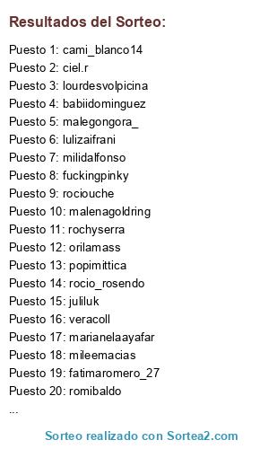 Lista de participantes: cami_blanco14 (70 participaciones), camipittaluga, agostinaanaliaaok, juliluk, juli.dagotto(2 participaciones), romibaldo, ciel.r, camiila_victoria, pocketsizedperfectionist, july_diber, larasantt, gabiifrattini, irmaperotti, lulagraziano (3 participaciones), fatimaromero_27, meligomez1603, jazpatricio, soldallacqua, josefinalahargou, camidominguezr, martigianorio, julicastagnetti, carliselene, calupappalardo, mileemacias, carochaparroo, zap_agustina, camusimone (2 participaciones), margilardoni, martinajaleff, gianepx, agusmineo, micolrobledo, maguibouchard, jaeldahuach, martusimone, juliana_ott, rocio_rosendo, cande.nigro (2 participaciones), lourdesvolpicina (5 participaciones), micapombo, rociouche, sol_koller (2 participaciones), piluucarbone, popimittica (2 participaciones), shishuu, luciabarrionuevohodara (2 participaciones), aixayafar (2 participaciones), zozoverbena (2 participaciones), melulopezb, floorpascua, marianelaayafar, candelacabrera1 (2 participaciones), rochyserra (4 participaciones), clarisa_mb (2 participaciones), milidalfonso (3 participaciones), fflo.wer (2 participaciones), cotyburjel, camiorliche_, nicolemoauro (4 participaciones), veracoll (2 participaciones), verydelapeople, danivarela91, male_carmona (2 participaciones), darylborrelli (2 participaciones), malenagoldring, candefernandez12 (3 participaciones), agostinapotenza, vickyloschi, lulizaifrani (2 participaciones), cecitendino (2 participaciones), martupekolj_ (5 participaciones), jazlizaso, fuckingpinky (2 participaciones), babiidominguez (3 participaciones), michechandia (2 participaciones), _valenalvarez, valugaray (2 participaciones), malegongora_ (3 participaciones), deekuji (2 participaciones), florghersi, antonellademartin (3 participaciones), orilamass (5 participaciones), orilamass.