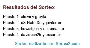 Lista de participantes: howsitgon y erizomaster, davidbcn25 y oscarcbr , aleivii y greyfx, oX Hate Xo y javiferrer.