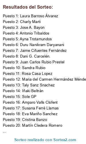 Lista de participantes: , Jose A. Bayon, Iñaki Beltrán, Amparo Valls Clofent, Antonio Tribaldos, Ayna Trotamundos, Laura Barroso Álvarez, Duru Nanikram Daryanani, Sole GP, M Amparo Frasquet, Charly Marti, Maria del Carmen Hermández Méndez, Pablo Rubio Prestel, Rosa Casa Lopez, Juan Rubio, Yolanda Gutierrez Gómez, Susana Ferré Llamas, Dani G. Carcelén., Martín Cledera Romero, Taly Sanz Snachez, Sandra Rubio, Juan Carlos Rubio Prestel , Cristina Banzo, Eva Mariño Sanchez, Jaime Cifuentes Fernández, Alejandro Martín Gutiérrez, Alférez Mariscal.