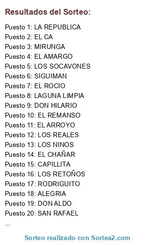 Lista de participantes: ALEGRIA, BUENA ESPERANZA, CAA CUPE, CABAÑA PILAGA, CAPILLITA, DON ALDO, DON HILARIO, DON LUIS, EL AMARGO, EL ARROYO, EL CA, EL CHAÑAR, EL GUADAL, EL MALACARA DEL MORO, EL PORVENIR, EL QUEBRACHO, EL REMANSO, EL RETIRO, EL ROCIO, EL SARALU, EL SIRIGOTE, EL TIGRE, ESTANCIA VIEJA, LA ASUNCION, LA CARRETA, LA ESMERALDA, LA MANSION, LA REPUBLICA, LAGUNA LIMPIA, LAS MERCEDES, LAS PALMERAS, LOS CHARABONES, LOS CUATRO HERMANOS, LOS GUASUNCHOS, LOS NINOS, LOS NOGALES, LOS ORIGENES, LOS REALES, LOS RETOÑOS, LOS SOCAVONES, MARCAOJO, MIRUNGA, OJO DE AGUA, RANCHO GRANDE, RODRIGUITO, SAN ALEJO, SAN CARLOS, SAN RAFAEL, SAN VICENTE, SANTA IRENE, SIERRAS CHICAS, SIGUIMAN, .