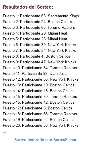 Lista de participantes: Participante 1: Boston Celtics, Participante 2: Boston Celtics, Participante 3: Boston Celtics, Participante 4: Boston Celtics, Participante 5: Boston Celtics, Participante 6: Boston Celtics, Participante 7: Boston Celtics, Participante 8: Boston Celtics, Participante 9: Boston Celtics, Participante 10: Boston Celtics, Participante 11: Boston Celtics, Participante 12: Boston Celtics, Participante 13: Boston Celtics, Participante 14: Boston Celtics, Participante 15: Boston Celtics, Participante 16: Boston Celtics, Participante 17: Boston Celtics, Participante 18: Boston Celtics, Participante 19: Boston Celtics, Participante 20: Boston Celtics, Participante 21: Boston Celtics, Participante 22: Boston Celtics, Participante 23: Boston Celtics, Participante 24: Boston Celtics, Participante 25: Miami Heat, Participante 26: Miami Heat, Participante 27: Miami Heat, Participante 28: Miami Heat, Participante 29: Miami Heat, Participante 30: Miami Heat, Participante 31: Miami Heat, Participante 32: Miami Heat, Participante 33: New York Knicks, Participante 34: New York Knicks, Participante 35: New York Knicks, Participante 36: New York Knicks, Participante 37: New York Knicks, Participante 38: New York Knicks, Participante 39: New York Knicks, Participante 40: New York Knicks, Participante 41: New York Knicks, Participante 42: New York Knicks, Participante 43: New York Knicks, Participante 44: New York Knicks, Participante 45: New York Knicks, Participante 46: New York Knicks, Participante 47: New York Knicks, Participante 48: New York Knicks, Participante 49: New York Knicks, Participante 50: New York Knicks, Participante 51: New York Knicks, Participante 52: New York Knicks, Participante 53: New York Knicks, Participante 54: New York Knicks, Participante 55: New York Knicks, Participante 56: New York Knicks, Participante 57: New York Knicks, Participante 58: New York Knicks, Participante 59: Sacramento Kings, Participante 60: Sacramento Kings, Participante 61: Sacramento Kings, Participante 62: Sacramento Kings, Participante 63: Sacramento Kings, Participante 64: Sacramento Kings, Participante 65: Sacramento Kings, Participante 66: Sacramento Kings, Participante 67: Sacramento Kings, Participante 68: Toronto Raptors, Participante 69: Toronto Raptors, Participante 70: Toronto Raptors, Participante 71: Toronto Raptors, Participante 72: Toronto Raptors, Participante 73: Toronto Raptors, Participante 74: Toronto Raptors, Participante 75: Toronto Raptors, Participante 76: Toronto Raptors, Participante 77: Toronto Raptors, Participante 78: Toronto Raptors, Participante 79: Toronto Raptors, Participante 80: Toronto Raptors, Participante 81: Toronto Raptors, Participante 82: Toronto Raptors, Participante 83: Toronto Raptors, Participante 84: Toronto Raptors, Participante 85: Toronto Raptors, Participante 86: Toronto Raptors, Participante 87: Toronto Raptors, Participante 88: Toronto Raptors, Participante 89: Toronto Raptors, Participante 90: Toronto Raptors, Participante 91: Toronto Raptors, Participante 92: Utah Jazz, Participante 93: Utah Jazz, Participante 94: Utah Jazz, Participante 95: Utah Jazz, Participante 96: Utah Jazz, Participante 97: Utah Jazz, Participante 98: Utah Jazz, Participante 99: Utah Jazz, Participante 100: Utah Jazz.