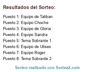 Lista de participantes: Equipo de Ulises, Equipo de Taliban , Equipo de Gloria, Equipo Choche, Equipo Roger, Equipo Sandra , Tema Sobrante 1, Tema Sobrante 2.