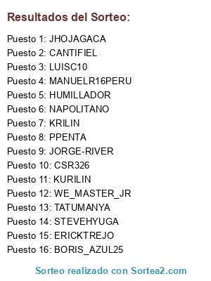 Lista de participantes: STEVEHYUGA, CANTIFIEL, HUMILLADOR, LUISC10, BORIS_AZUL25, TATUMANYA, ERICKTREJO, MANUELR16PERU, JHOJAGACA, CSR326, NAPOLITANO, KURILIN, WE_MASTER_JR, KRILIN, JORGE-RIVER, PPENTA.
