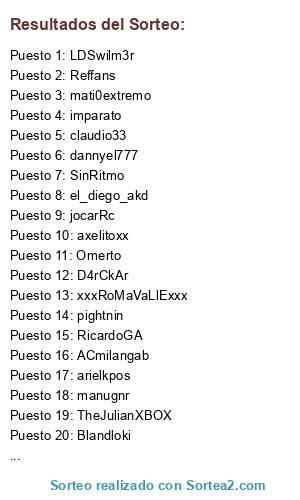 Lista de participantes: s3firot, imparato, Blandloki, mati0extremo, K_evin, nahuelriver94, arielkpos, xxxRoMaVaLlExxx, ezequiel_55, el_diego_akd, DipiSlipknot, Minors12, ACmilangab, jocarRc, SinRitmo, claudio33, LDSwilm3r, PsrfYankee, camaranob, Reffans, axelitoxx, Omerto, RicardoGA, dannyel777, marcosaww, D4rCkAr, TheJulianXBOX, pightnin, gyen, fakufloyd, jotero15, manugnr.